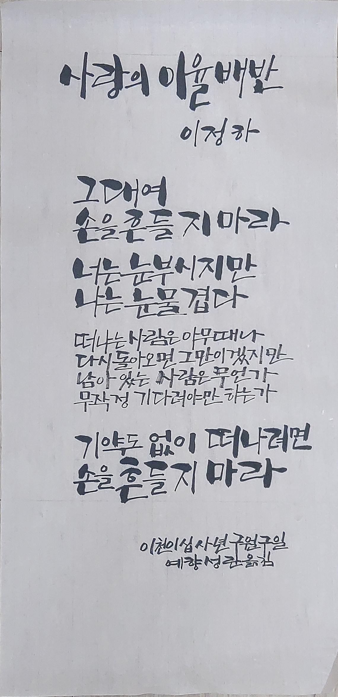달(月)의 시간 속에서 손성란 살아 움직이는 것들과 온 힘을 다하여 대결하던 아침 해처럼 도대체 서녘하늘로 돌아갈 것 같지 않던 푸드덕푸드덕 날개짓에 비늘이 떨어져도 아픈 줄도 고된 줄도 모르던 해(日)의 시간들이 어느 새 그렇게 가버렸다. 이미 건너버린 세월의 강 위로 떠오른 달(月)의 시간들이 고향집 안방처럼 푸근하게 잔기침 한 번 없이 온몸에 감겨 버렸다. 언제부터 인지 정수리에 꽂힌 새치를 더 이상 가려낼 수 없었던 것처럼 가루가 빻아지던 말던 언제나 마주보고 서서 방아를 찧는 달 속의 두 마리 토끼처럼 자연의 경이로움에 두 손 들고 항복한 채 조용히 미소짓는 시간이 그렇게 그렇게 오고야 말았다.